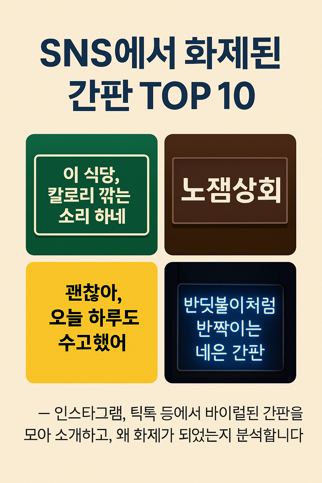 SNS에서 화제된 간판 TOP 10– 인스타그램, 틱톡 등에서 바이럴된 간판을 모아 소개하고, 왜 화제가 되었는지 분석합니다.